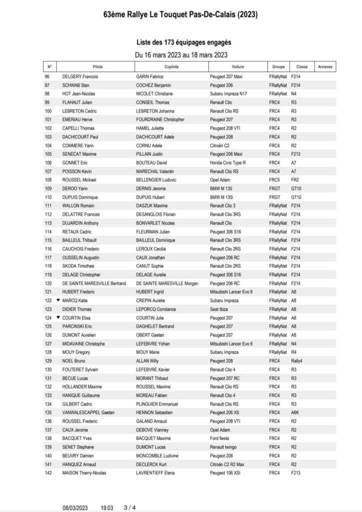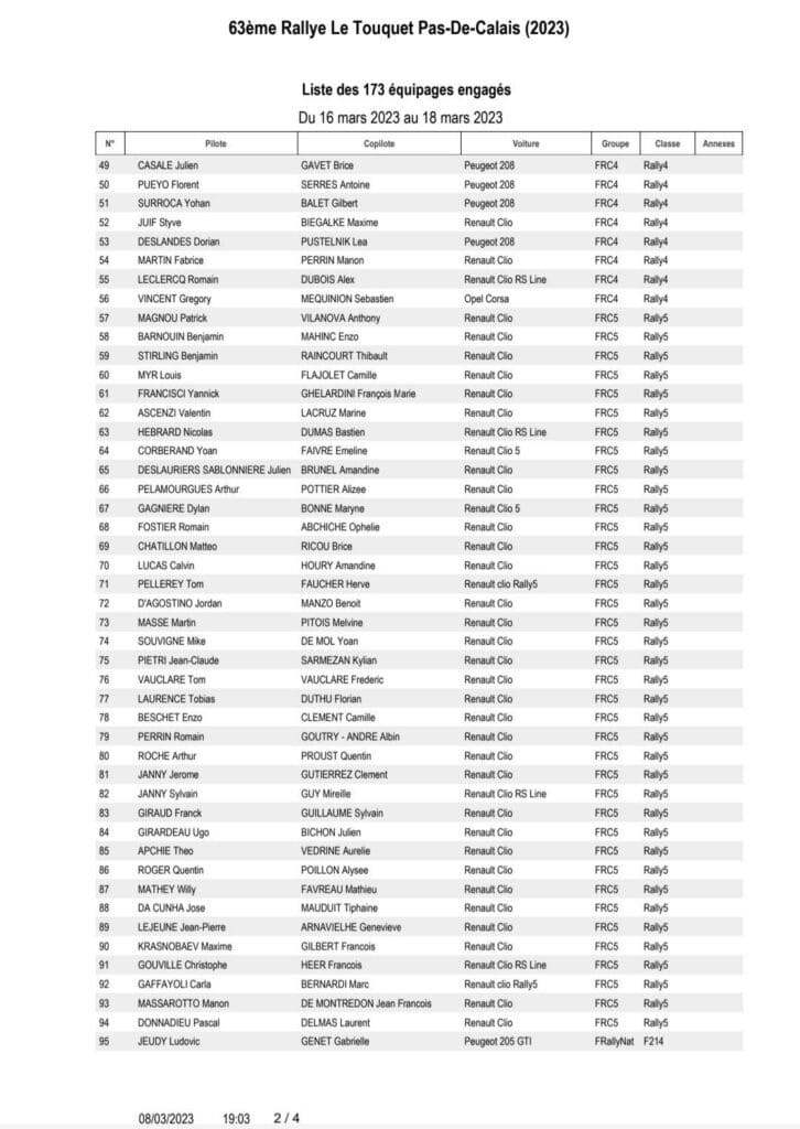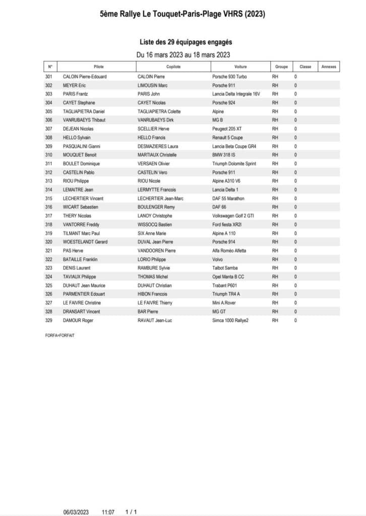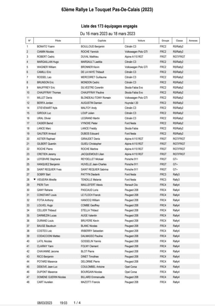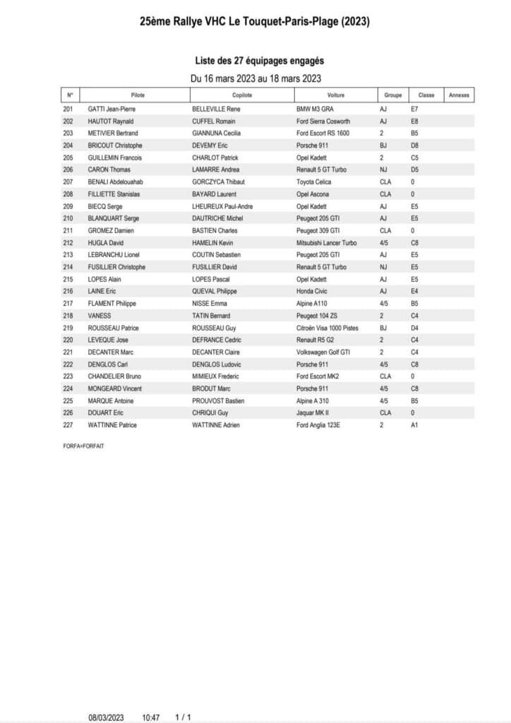 Ca y est la liste tant attendue des engagés du rallye du Touquet qui marquera le début de la saison du Championnat de France des rallyes vient de sortir et ce seront au total 229 équipages qui seront au départ avec 173 Modernes, 27 VHC et enfin 29 VHRS !