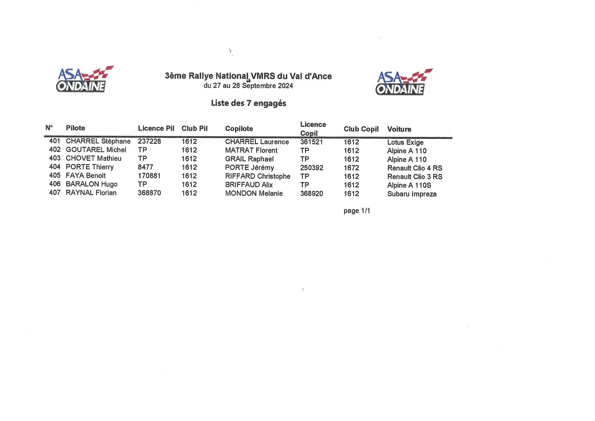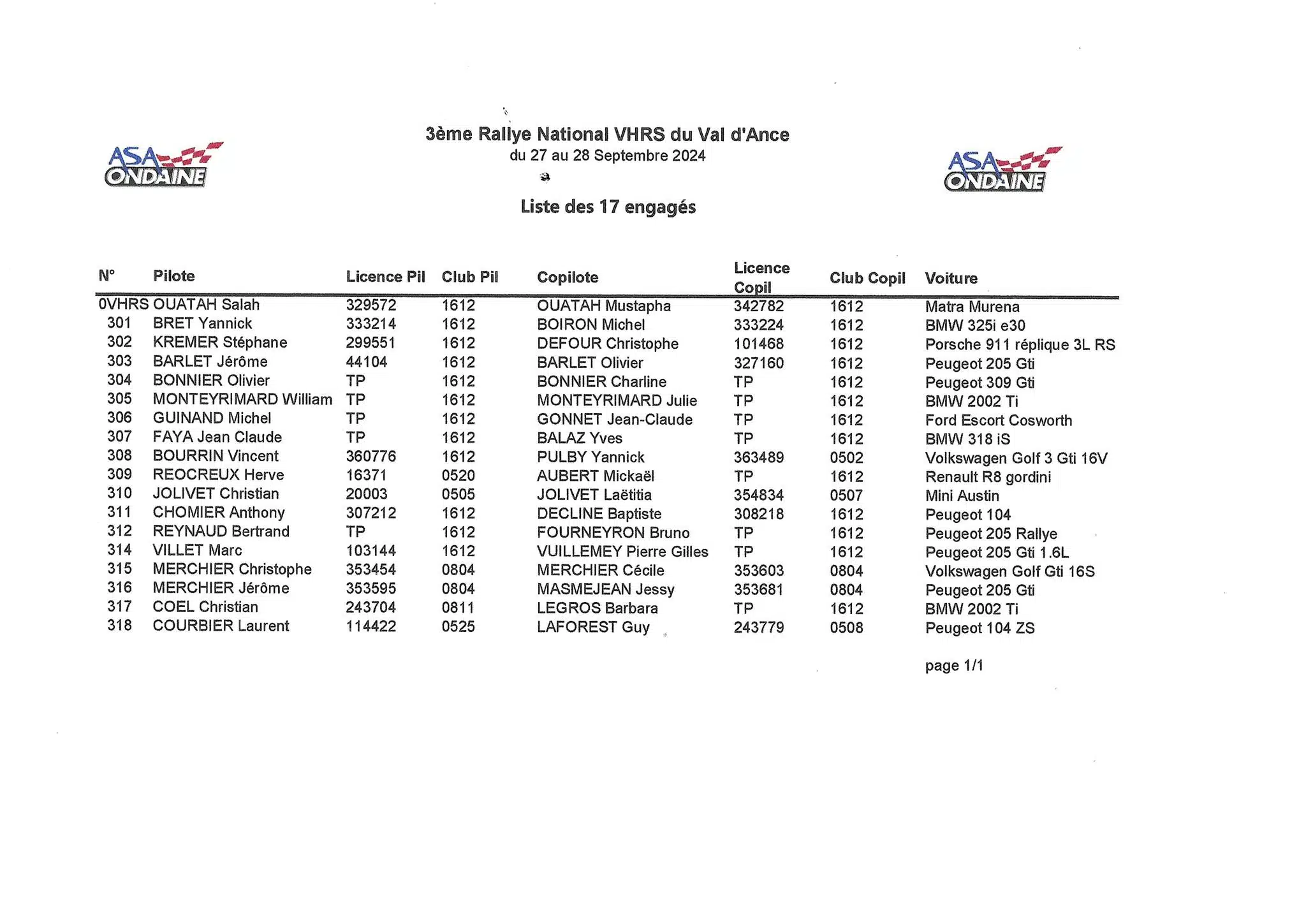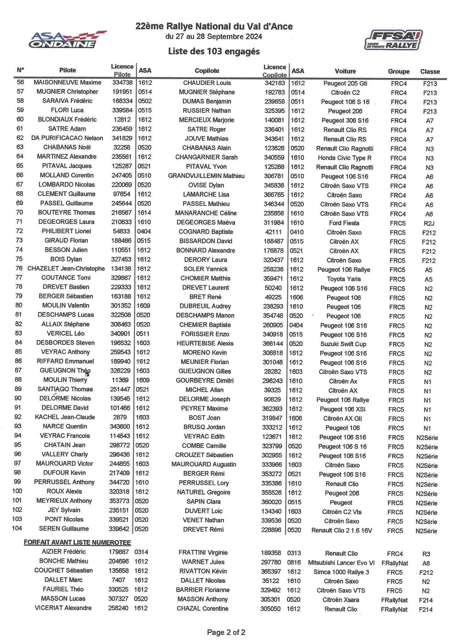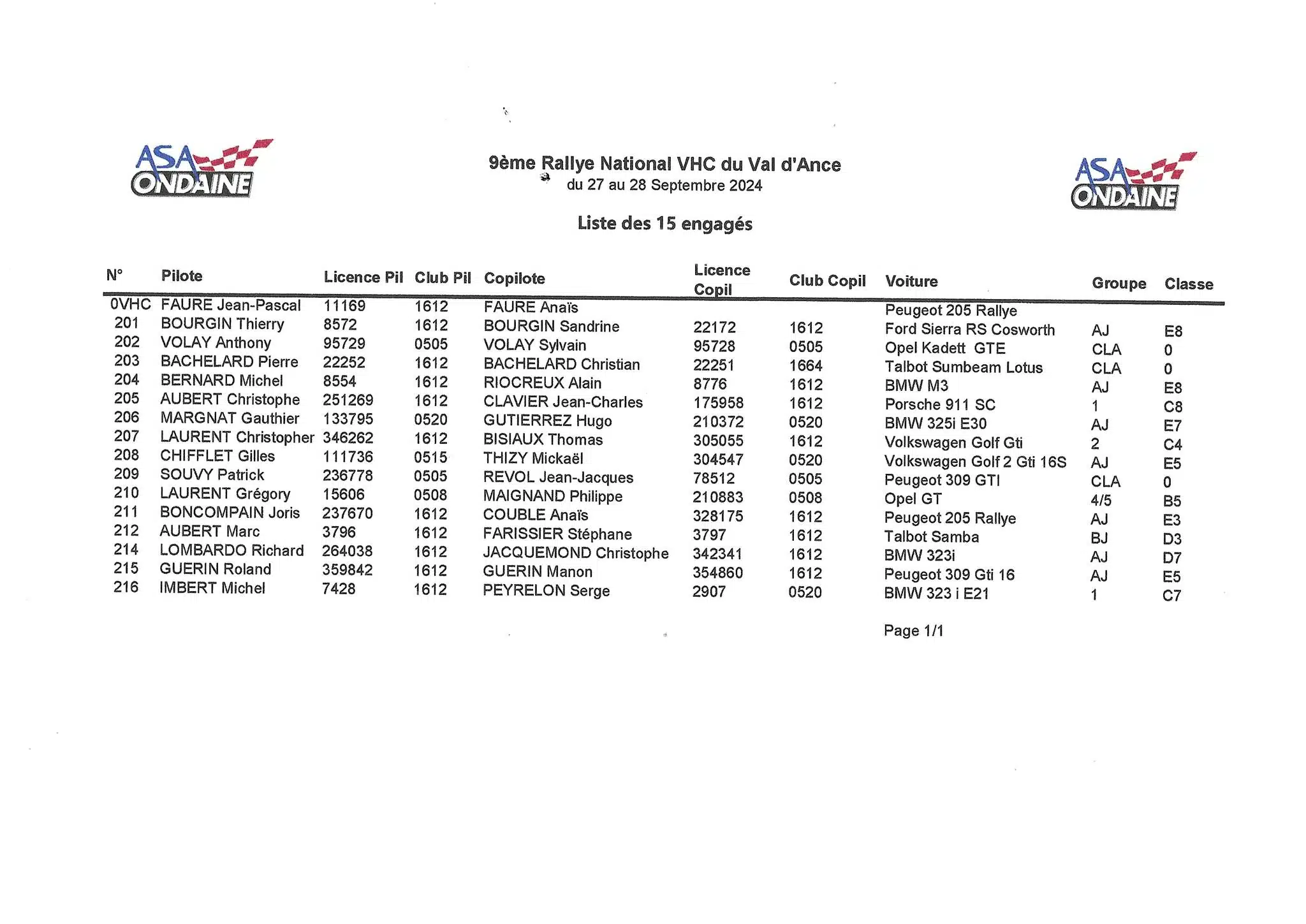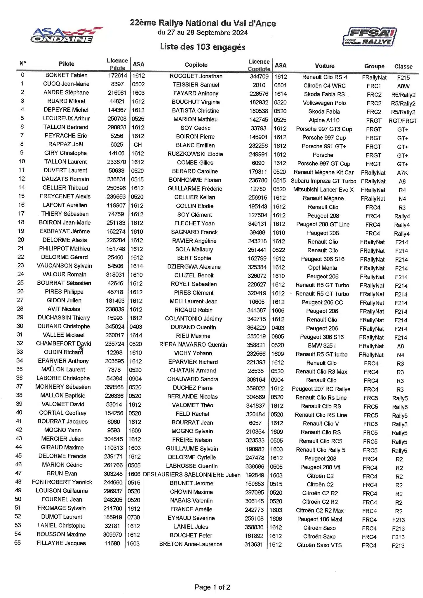 Rallye du Val d’Ance 2024 : Liste des engagés