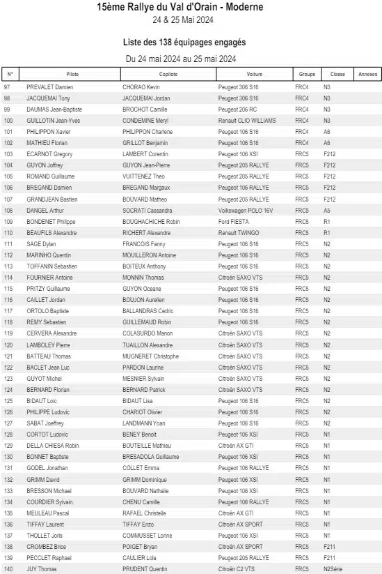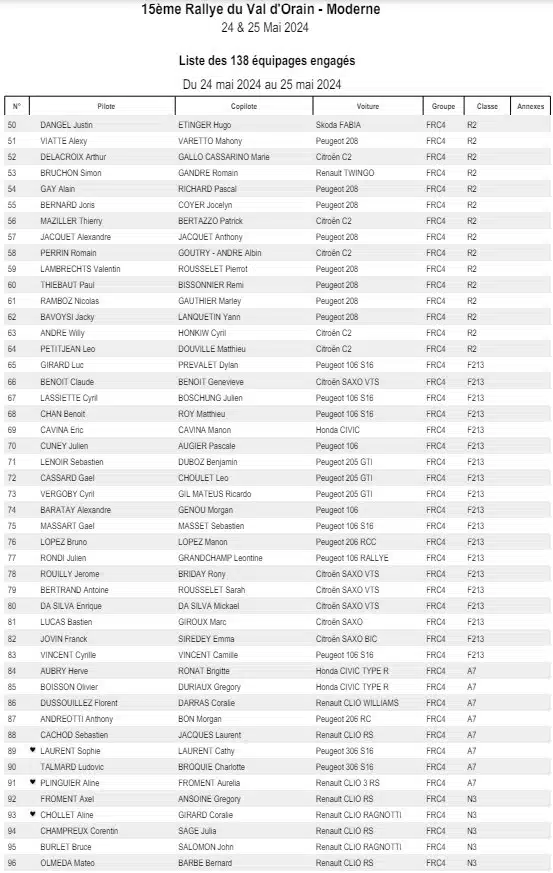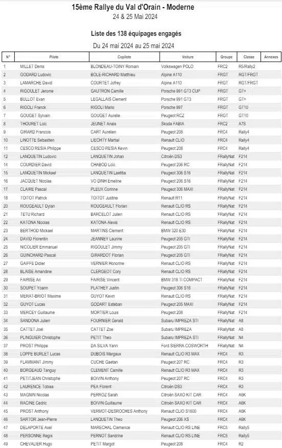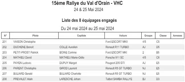 Le Rallye du Val d’Orain 2024 sera organisé les 24 et 25 mai 2024 par l’ASA Jura et l’Écurie du Val d’Orain avec au programme six spéciales pour un parcours total de 143.4 km dont 36 km de chrono.