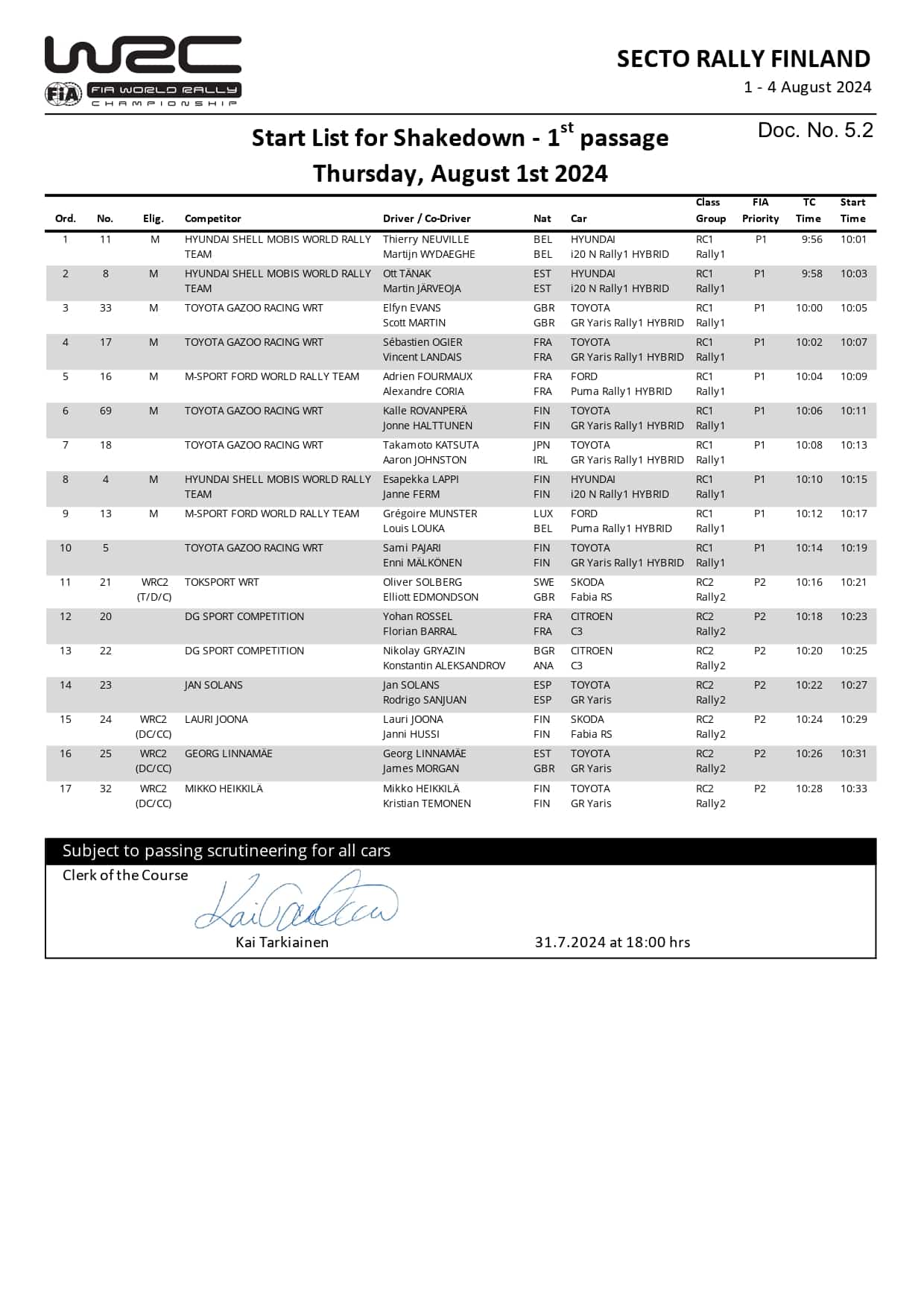 | #5 | Pajari Sami | Toyota GR Yaris Rally1 Hybrid | 2:18.9 | 2:17.2 | VIP | |