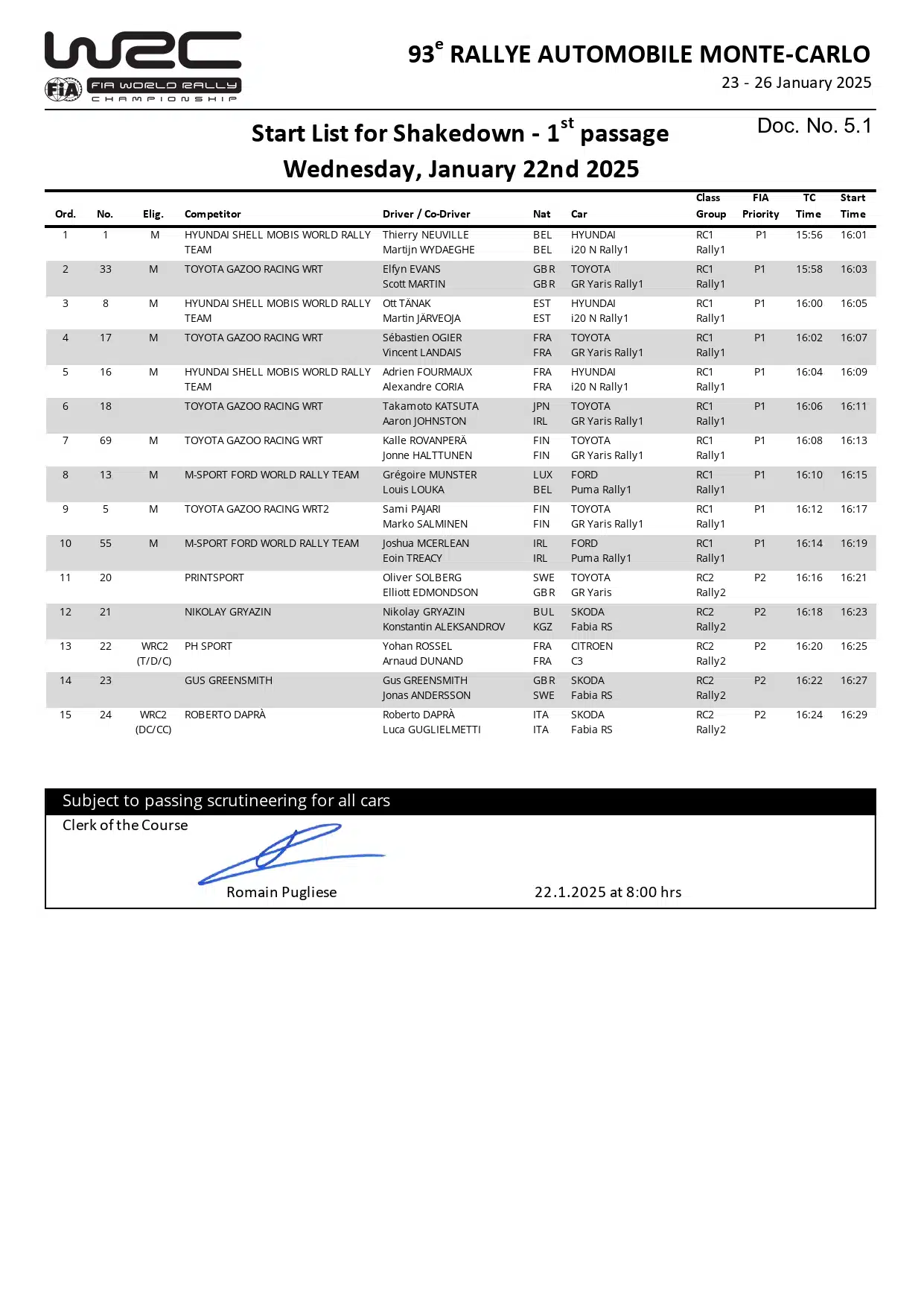 Rallye Monte-Carlo 2025 : Shakedown – Liste de départ