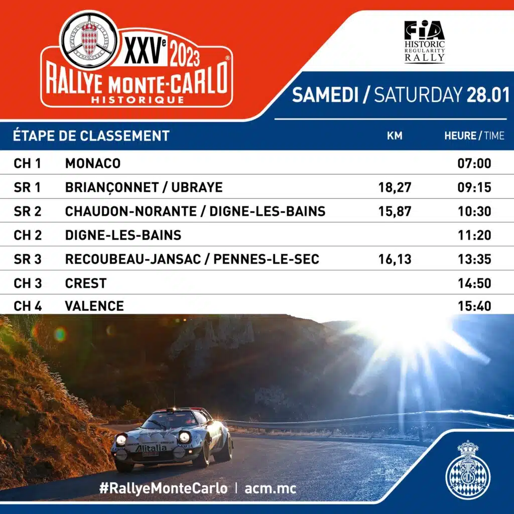 samedi 28 janvier à partir de 07h00, début de l’Etape de Classement, avec quatre SR à disputer durant la montée vers Valence, préfecture du département de la Drôme, une nouvelle fois Ville étape de l’évènement. En guise de hors d’œuvre, la copieuse « Briançonnet – Ubraye / SR 1 / 09h20 / 18,27 km », avec notamment le passage des Col du Buis (1196 m) et de Laval (1100 m) à négocier dans la vallée d’Ubraye, à cette période de l’année où neige et verglas sont très souvent omniprésents. Ensuite direction « Chaudon-Norante – Digne-les-Bains / SR 2 / 10h35 / 15,79 km » et son illustre Col du Corobin (1211 m) à braver. Dans la foulée, Digne-les-Bains accueille place du Tampinet, le contrôle horaire de mi-journée (11h20). Une courte pause avant d’enchaîner avec « Le Castellard-Mélan – Sisteron / SR 3 / 12h00 / 33,34 km » et le redouté Col Fontbelle (1304 m) puis « Recoubeau-Jansac – Pennes-le-Sec / SR 4 / 14h30 / 16,12 km » et le passage du Col de Pennes (1040 m) pour clore sportivement cette étape. Un dernier contrôle horaire est programmé à Crest (15h40) afin de réguler les équipages avant leur arrivée Champ de Mars à Valence (16h30).