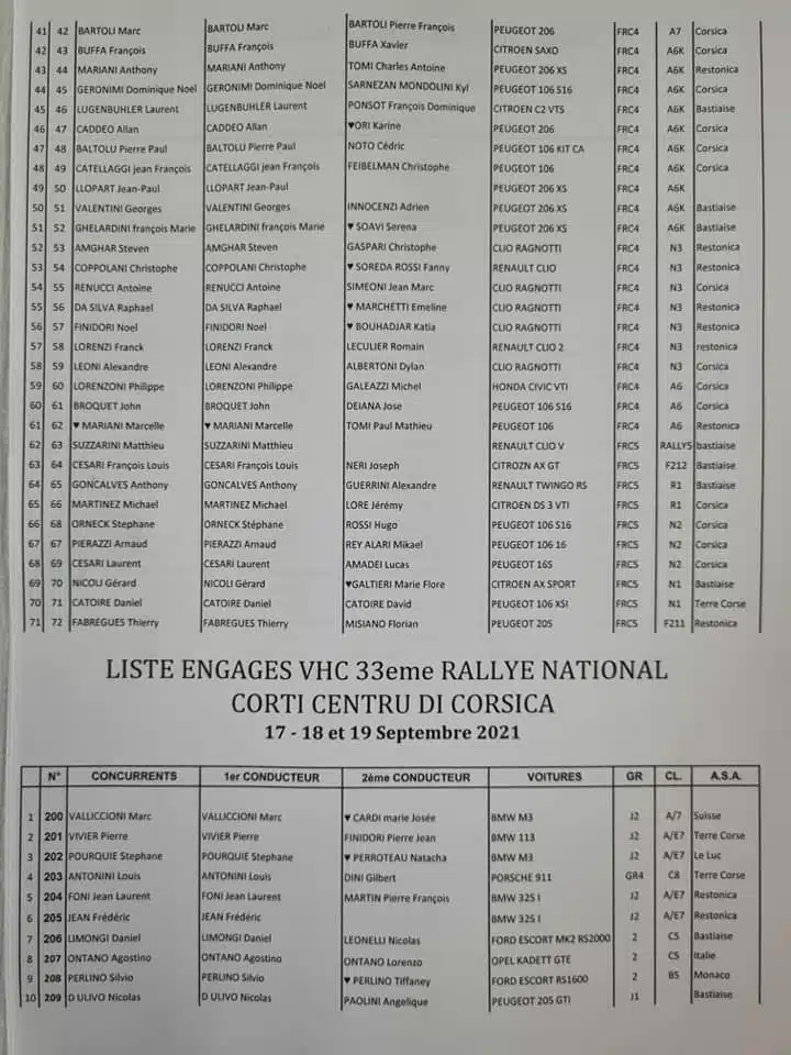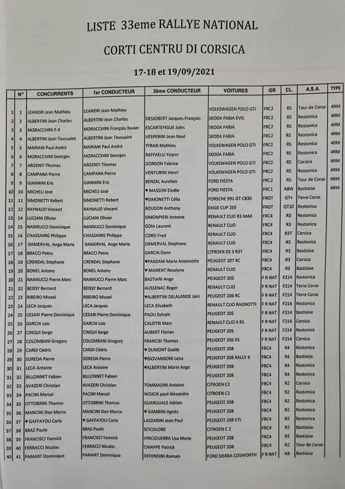 Organisée par, la 33 ème édition du Rallye National Corti Centru di Corsica qui se déroulera les 17 et 18 Seeptembre vient de dévoiler sa liste d’engagés avec plus de 70 voitures au départ et Jean Mathieu Léandri qui fera office de grandissime favoris sur sa Polo GTI R5.