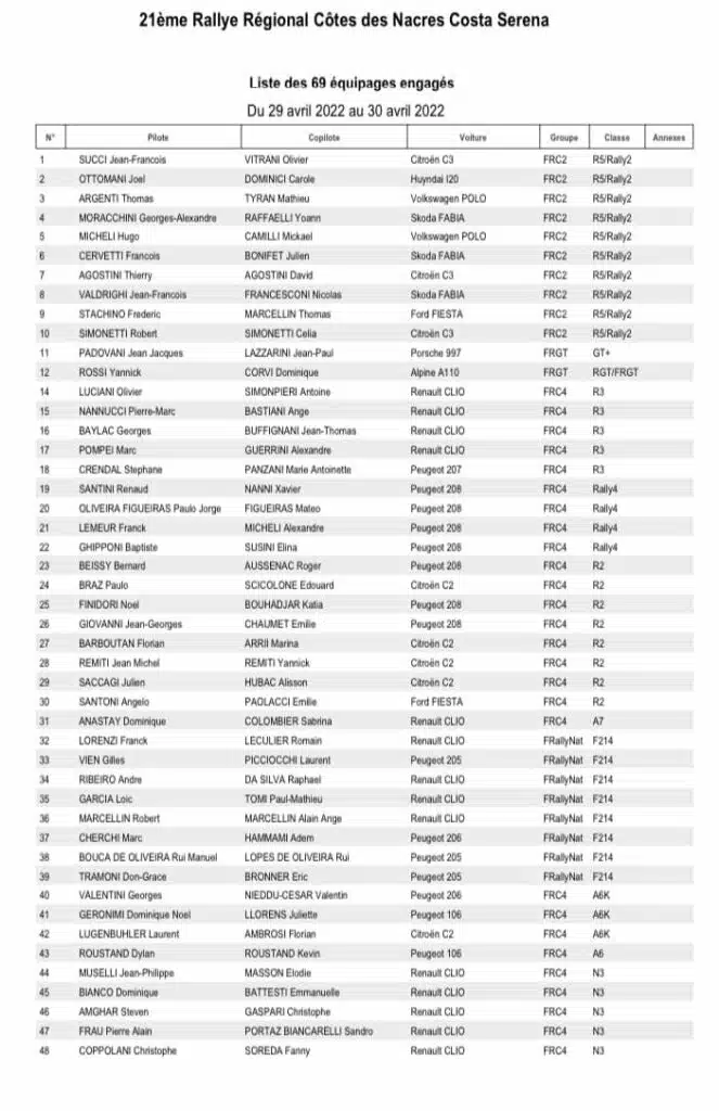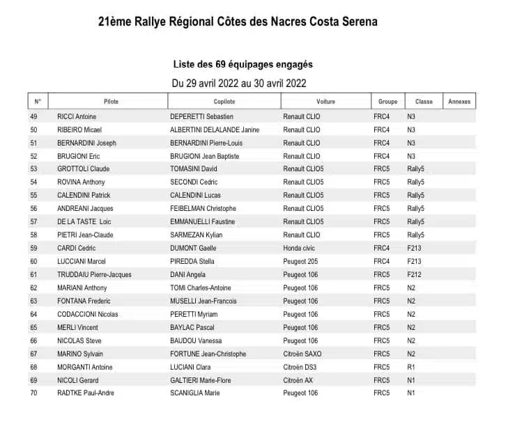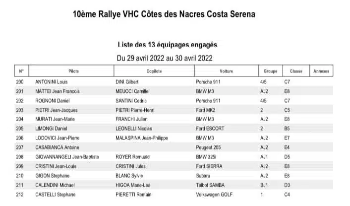 La 21 ème édition du Rallye régional Côte des Nacres – Costa Serena & VHC sera organisée les 29 et 30 avril 2022 par l’ASA Terre de Corse et la Squatra di e Pieve, ligue Corse. Au programme, vérifications administratives et techniques le vendredi et une spéciale de 13 km 300 pour trois passages le samedi !