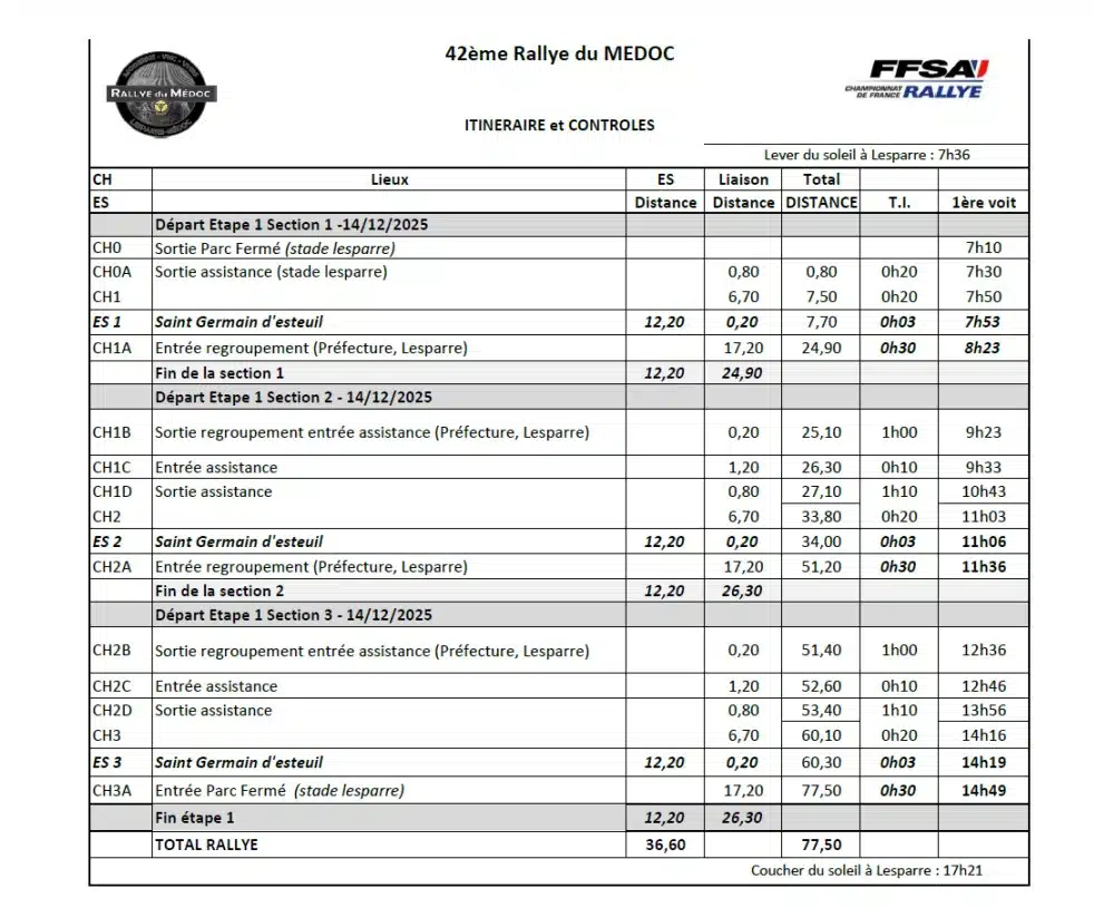 Le 42ème rallye régional du Médoc E.Leclerc représente un parcours de 80 km, divisé en 1 étape et 3 sections Il comporte 1 épreuve d’une longueur totale de12,05 km à faire 3 fois, d’une longueur totale de 36,15 km (ES1-2-3 : Saint germain d’esteuil)