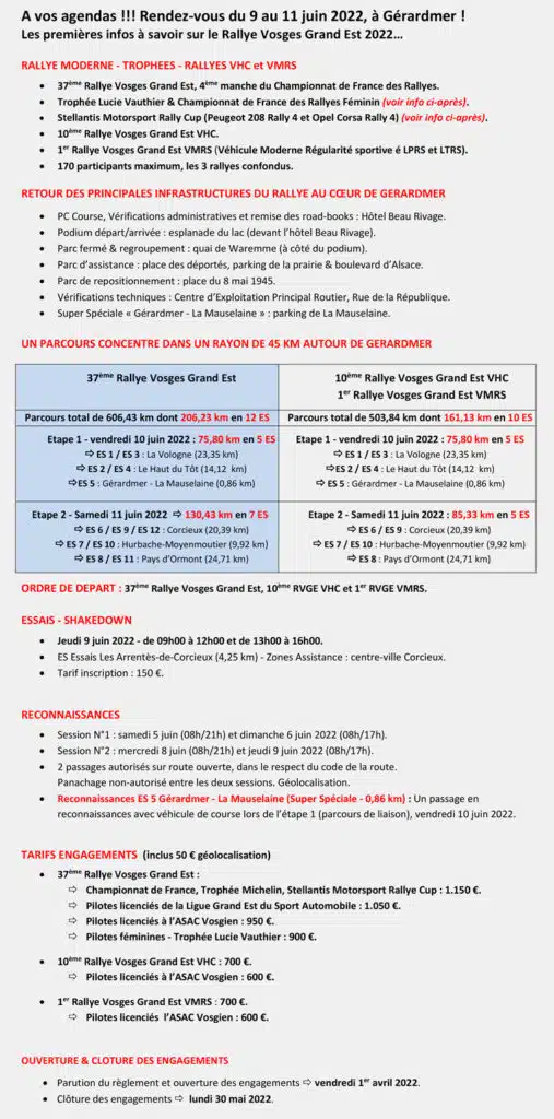 La 37 ème édition du Rallye Vosges Grand Est se déroulera du 9 au 11 Juin 2022. La quatrième manche du Championnat de France des rallyes se dévoile avec douze spéciales au programme et un peu plus de 200 kilomètres chronométrés.