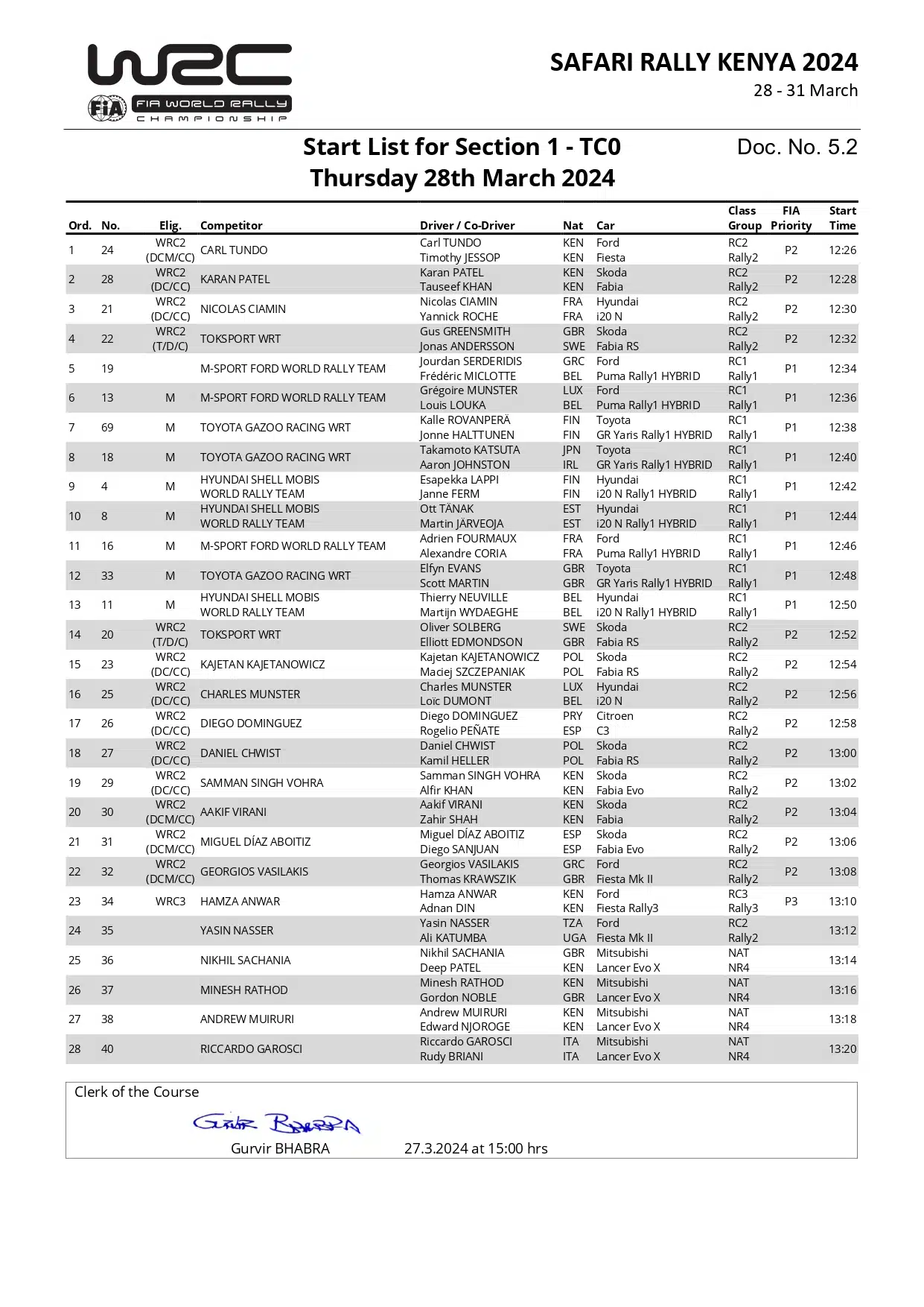 Une seule spéciale prévue aujourd’hui avec la Super Special Kasarani et ses 4.84 km qui seront à vivre dès 12h05. Et c’est Carl Tundo qui ouvrira la route devant Karan Patel et Nicolas Ciamin. Il faudra attendre la cinquième voiture pour voir les Rally1 en action avec Jourdan Serderidis.