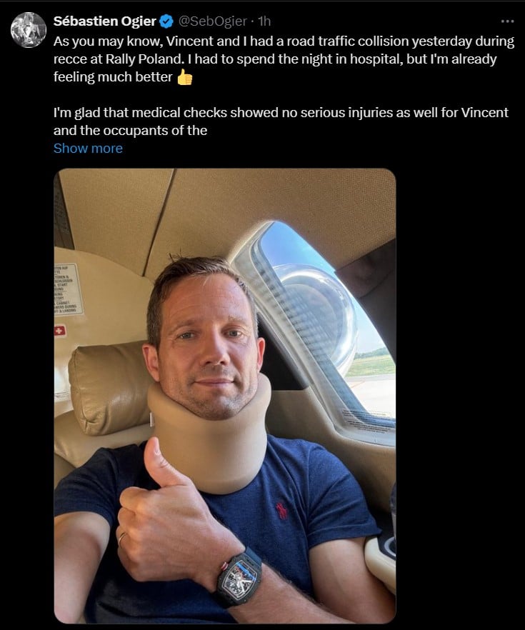 « Comme vous le savez peut-être, Vincent et moi avons eu un accident de la route hier lors des reconnaissances du Rallye de Pologne. J’ai dû passer la nuit à l’hôpital, mais je me sens déjà beaucoup mieux. Je suis heureux que les contrôles médicaux n’aient révélé aucune blessure grave non plus pour Vincent et les occupants de l’autre voiture. Nous ne pouvons pas participer à ce rallye, ce qui est dommage, mais le plus important est que toutes les personnes impliquées soient en sécurité. Merci à tous pour tous les messages que j’ai reçus. Je suis maintenant sur le chemin du retour pour me reposer et être sûr de revenir bientôt en pleine forme. Bonne chance à Kalle Rovanpera JonneHalttunen et toute l’équipe, je vous encouragerai ! » a commenté Sébastien Ogier via (1) Sébastien Ogier (@SebOgier) / X