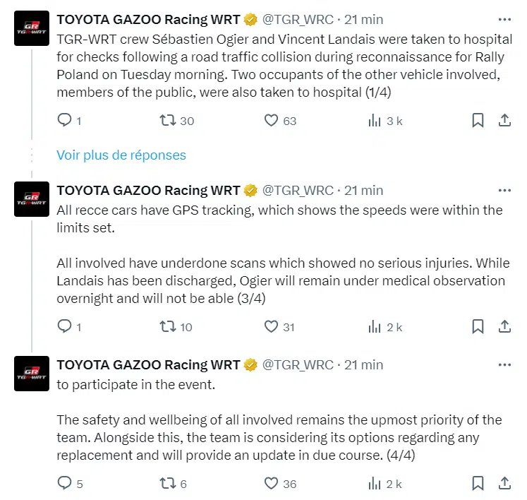 « »Toutes les personnes blessées ont passé des examens qui n’ont révélé aucune blessure sérieuse. Mais si Vincent (Landais) a reçu l’autorisation de quitter l’hôpital, Sébastien (Ogier) va rester sous surveillance médicale cette nuit et ne sera pas en mesure de participer au rallye. » a commenté l’équipe Toyota sur ses réseaux sociaux