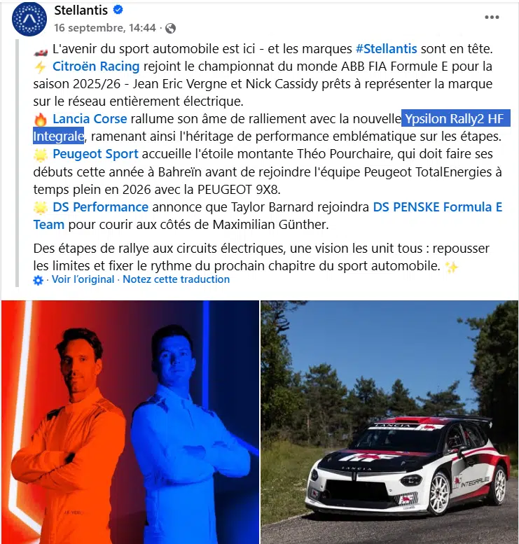 C’est Lancia avec sa toute nouvelle Ypsilon Rally2 HF Integrale qui reprendra le flambeau des activités de haut niveau dans les rallyes avec des programmes très certainement dans les Championnats nationaux ou en mondial via le WRC2.