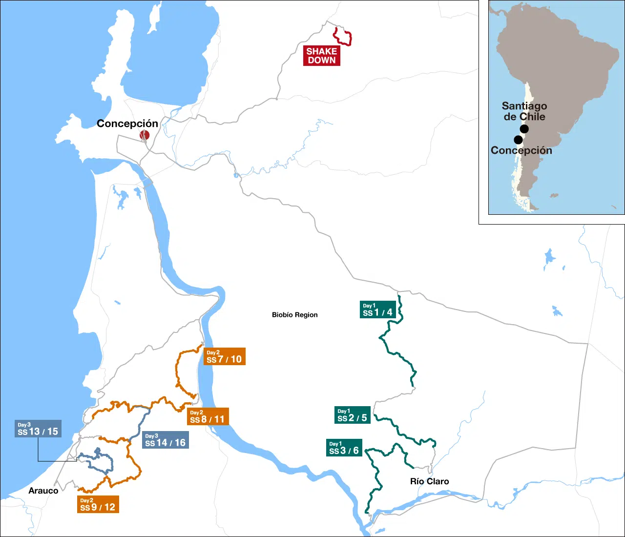Outre les défis physiques, la refonte de l’itinéraire par rapport à l’édition 2023 ajoute également un autre niveau de danger pour les équipages. Pelun (SS7/10, 15,65 km) revient pour la première fois depuis 2019 avec un parcours révisé, tandis que San Rosendo (SS3/6, 23,32 km), Lota (SS8/11, 25,64 km) et Laraquete (SS13/15, 18,62 km) figurent sur l’itinéraire avec de nouveaux noms mais des sections familières des années précédentes.