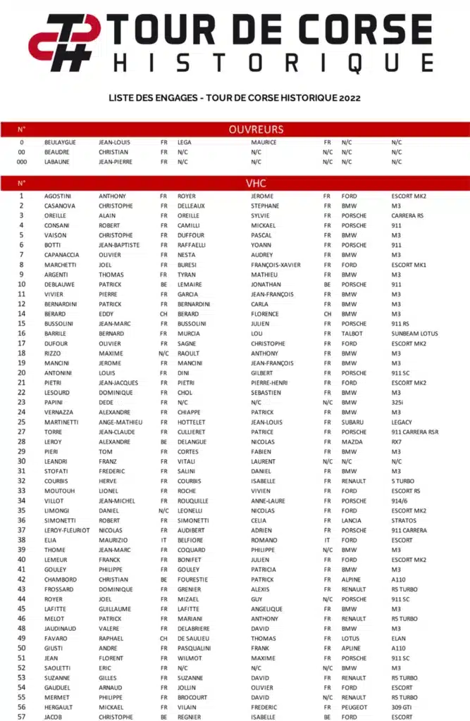 Ainsi, ce sont 380 voitures et leurs équipages, soit un nouveau record de participation (sur 530 demandes d’inscription reçues) qui seront au départ de cette nouvelle édition du Tour de Corse Historique qui se déroulera du 2 au 8 octobre prochains. Face à l’afflux sans précédent dans l’histoire de cette épreuve de demandes d’inscription venues de France et de l’étranger, l’équipe organisatrice du rallye s’est mobilisée et a déployé les moyens nécessaires (renforcement des équipes, multiplication des parcs d’accueil et des zones d’assistance…) afin d’accueillir dans les meilleures conditions ce nouveau record de participants.