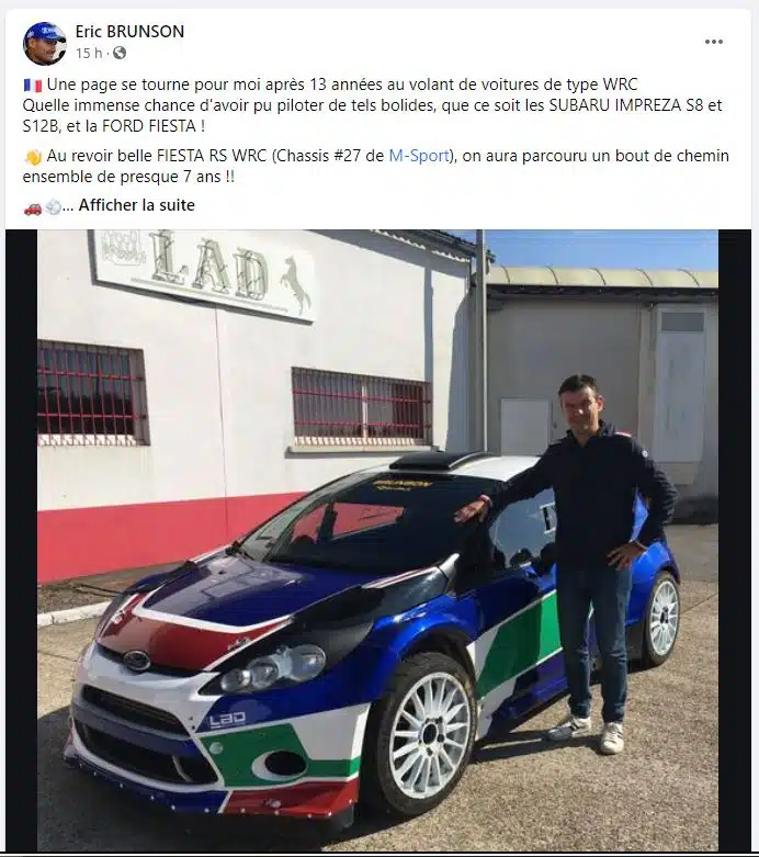 « Une page se tourne pour moi après 13 années au volant de voitures de type WRC. Quelle immense chance d’avoir pu piloter de tels bolides, que ce soit les SUBARU IMPREZA S8 et S12B, et la FORD FIESTA ! Au revoir belle FIESTA RS WRC (Chassis #27 de M-Sport), on aura parcouru un bout de chemin ensemble de presque 7 ans ! Bonne route pour tes nouvelles aventures, et en ce qui me concerne je vous tiendrai informé de la suite… » a commenté Eric Brunson