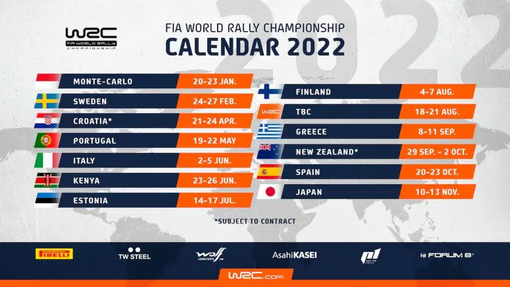 Ca y est le calendrier 2022 du WRC vient de sortir et ouvrira l’ère Hybride dès fin Janvier au Monté Carlo pour se terminer au Japon en Novembre. A noter que la treizième épreuve reste à déterminer !